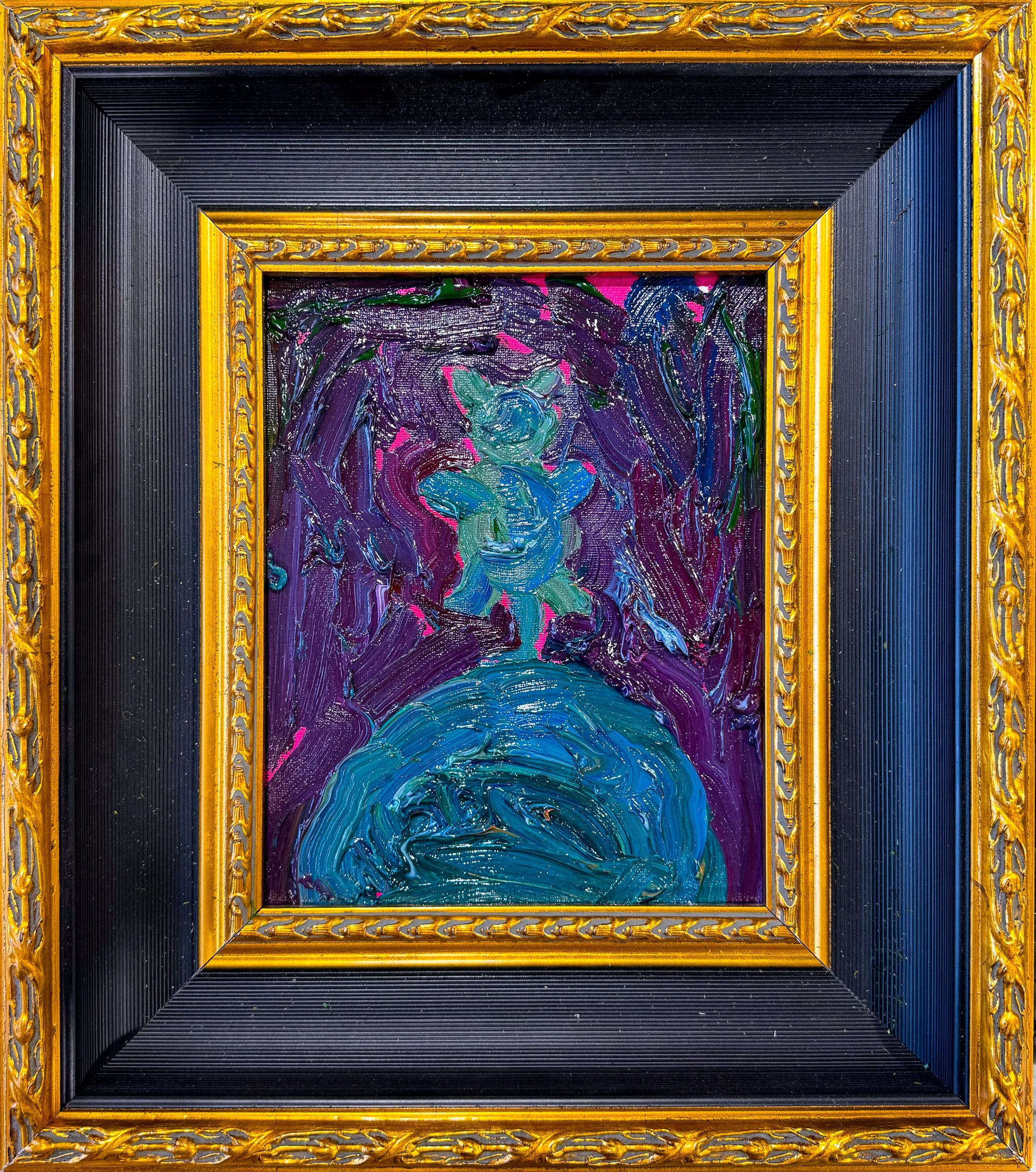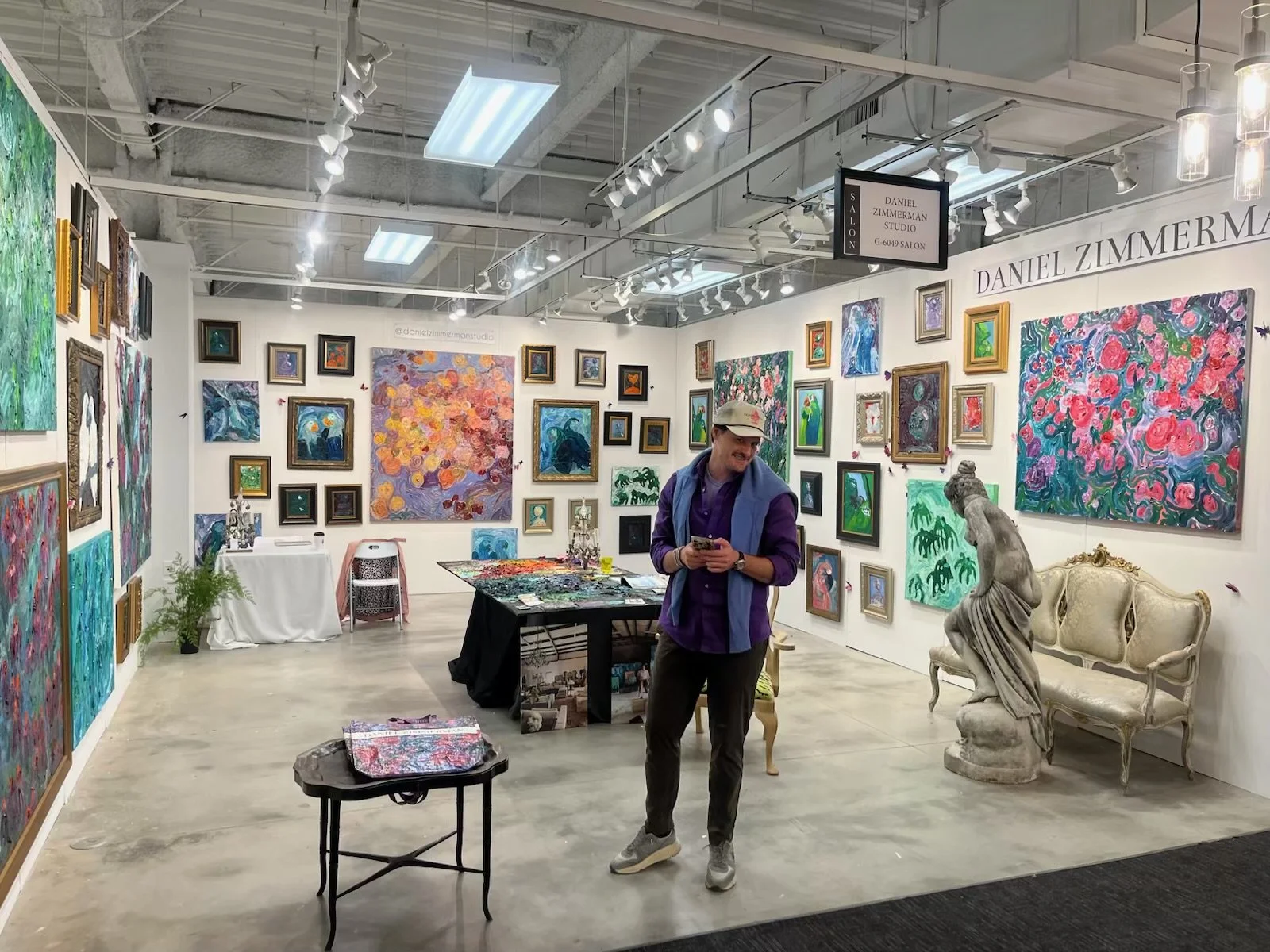 The arrangement—an eclectic constellation of frames, scales, and surfaces—creates the feeling of an ornate yet contemporary salon, where classical touches such as the decorative furniture and figurative sculpture meet the exuberance of Zimmerman’s modern palette. Large centerpiece canvases anchor the space, while smaller works cluster around them like bright fragments of a living garden.