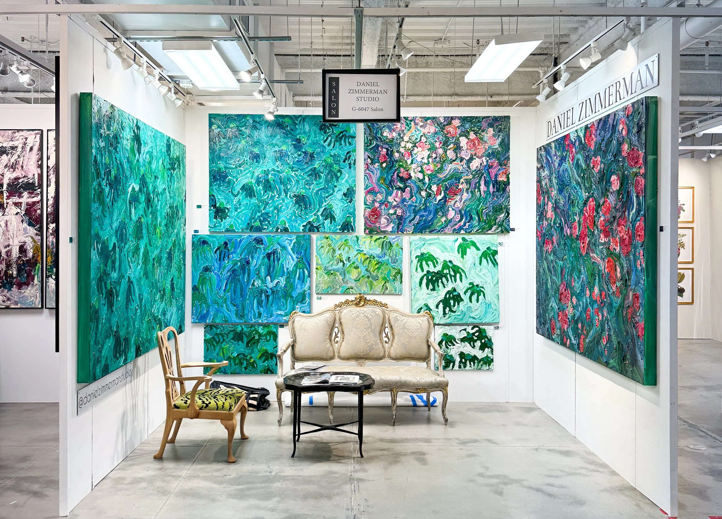 Zimmerman’s painterly exuberance is matched by the elegance of the salon-like setting, where antique furnishings meet bold contemporary gestures. This juxtaposition underscores the artist’s belief that beauty is timeless—and that spring, in all its chaos and charm, is a season worth celebrating again and again.